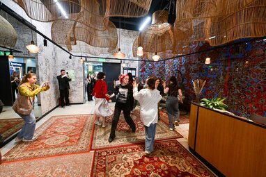 Председатель комитета общественных связей и молодежной политики города Москвы Екатерина Драгунова (слева по центру). Вторая смена молодежного творческого лагеря в кинопарке «Москино».