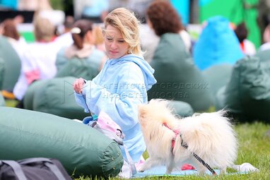 Международный день йоги в рамках проекта «Лето в Москве» на ВДНХ. Девушка с собакой породы шпиц по время занятий йогой.