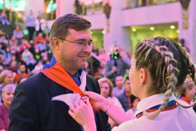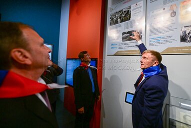 Директор Всероссийского детского центра «Орленок», председатель комитета законодательного собрания Краснодарского края Александр Джеус (справа). Открытие выставки «Орленок»: Код детства», посвященной 65-летию со дня основания детского центра «Орленок», в Музее Победы на Поклонной горе.