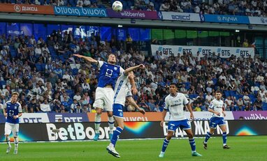 Игрок «Балтики» Элдар Чивич и игрок «Динамо» Хуан Хосе Касерес. Первый официальный матч сезона Российской премьер-лиги (РПЛ) 2025/26 «Динамо» (Москва) – «Балтика» (Калининград) на «ВТБ Арене».