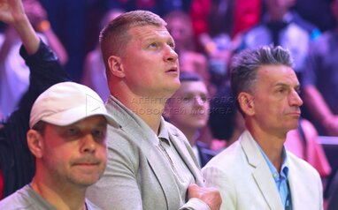 Боксер Александр Поветкин (в центре) во время боя Алексея Егорова (Россия) и Эражадае Обаро (Нигерия). Вечер профессионального бокса на титул WBA Continental Gold в Международном центре бокса в Москве.