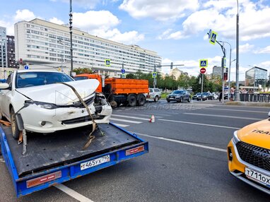 Автомобиль каршеринга после столкновение двух транспортных средств упал в Яузу на Рубцовской набережной, пострадали два человека.