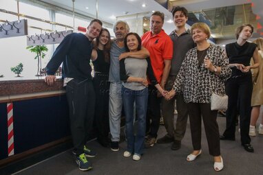Актеры театра «Эрмитаж» Василий Корсунов, Анна Богдан, Петр Кудряшов, Жанна Никонова, Сергей Олексяк и Андрей Павлов, Ислентьева Александра и Ким Дарья Кошева (слева направо). Сбор труппы в московском театре «Эрмитаж» перед началом 66-го сезона.