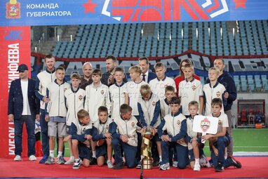 Церемония награждения команды ЦСКА (Москва), завоевавшей кубок в дисциплине кипербол в рамках Кубка Акинфеева на стадионе «Арена Химки».