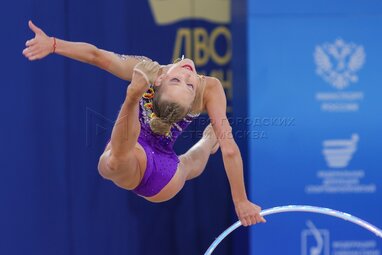 Упражнения с обручем во время индивидуальной программы гимнасток в заключительный день международных соревнованиях по художественной гимнастике «Кубок Сильнейших спортсменов» во Дворце Ирины Виннер в олимпийском комплексе «Лужники».