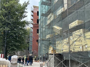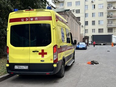 Обстановка возле нежилого здания в Старопименовском пер. в центре Москвы, где обрушились строительные леса. Двое рабочих субподрядной коммерческой организации пострадали.