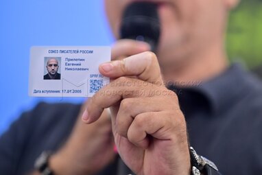 Удостоверение – членский билет Союза писателей России Захара Прилепина. Пятый день работы 38-й Московской международной книжной ярмарки и 3-й Московской международной детской книжной ярмарки на ВДНХ.