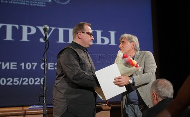 Генеральный директор МАМТ Андрей Борисов (слева) и заместитель заведующего театрально-производственными мастерскими МАМТ Сергей Бараев, получивший благодарственное письмо за вклад в развитие театра. Традиционный сбор труппы в Московском академическом музыкальном театре имени Станиславского и Немировича-Данченко в преддверии нового, 107-го сезона.