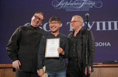 Генеральный директор МАМТ Андрей Борисов, солист оперы МАМТ Чингис Аюшеев, получивший благодарственное письмо за вклад в развитие театра, и художественный руководитель оперной труппы и главный режиссер МАМТ Александр Титель (слева направо). Традиционный сбор труппы в Московском академическом музыкальном театре имени Станиславского и Немировича-Данченко в преддверии нового, 107-го сезона.