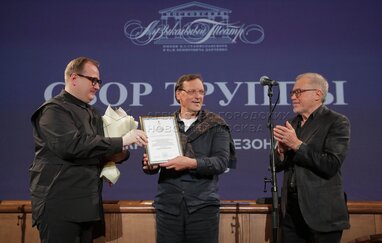 Генеральный директор МАМТ Андрей Борисов, заместитель заведующего художественно-постановочной частью МАМТ Сергей Узун, получивший благодарственное письмо за вклад в развитие театра, и художественный руководитель оперной труппы и главный режиссер МАМТ Александр Титель (слева направо). Традиционный сбор труппы в Московском академическом музыкальном театре имени Станиславского и Немировича-Данченко в преддверии нового, 107-го сезона.