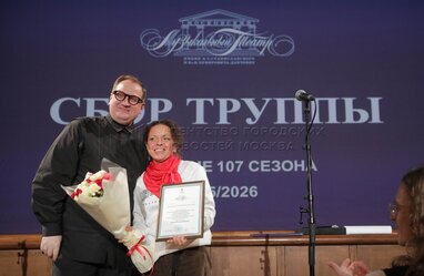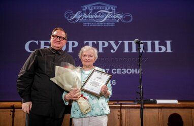 Генеральный директор МАМТ Андрей Борисов и дежурный хозяйственного отдела МАМТ Валентина Звонникова, получившая благодарственное письмо за вклад в развитие театра. Традиционный сбор труппы в Московском академическом музыкальном театре имени Станиславского и Немировича-Данченко в преддверии нового, 107-го сезона.