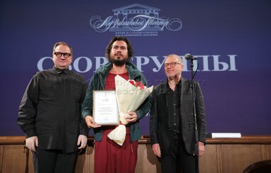 Генеральный директор МАМТ Андрей Борисов, солист балета, педагог-репетитор МАМТ Георги Смилевски, получивший благодарственное письмо за вклад в развитие театра, и художественный руководитель балетной труппы МАМТ Максим Севагин (слева направо). Традиционный сбор труппы в Московском академическом музыкальном театре имени Станиславского и Немировича-Данченко в преддверии нового, 107-го сезона.