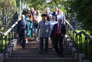 Председатель комитета Госдумы РФ по обороне Андрей Картаполов (слева по центру), председатель ЦК КПРФ Геннадий Зюганов (в центре) и дочь маршала Советского Союза Ивана Конева, руководитель Фонда памяти полководцев Наталья Конева (справа по центру). Открытие фотовыставки «Маршал Советского Союза Василевский А.М. Дело всей жизни» на Гоголевском бульваре.