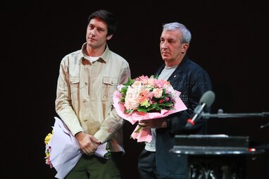 Актер Владимир Гуськов (слева) и заслуженный артист РФ, актер Александр Андриенко. Открытие 105-го сезона Театра имени Вахтангова.