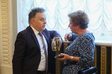 Директор Государственного академического театра имени Евгения Вахтангова Кирилл Крок и вдова народного артиста СССР В.Этуша – Елена Этуш. Открытие 105-го сезона Театра имени Вахтангова.