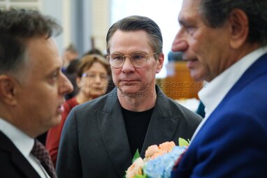 Актеры Александр Горбатов, Денис Самойлов и заслуженный артист РФ, актер Сергей Пинегин (слева направо на первом плане). Открытие 105-го сезона Театра имени Вахтангова.