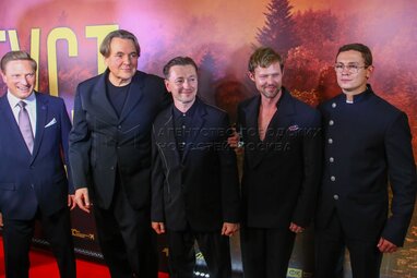 Генеральный директор медиахолдинга МАЕР Константин Майор, продюсер фильма «Август», генеральный директор Первого канала Константин Эрнст, актеры Сергей Безруков, Даниил Воробьев и Никита Кологривый (слева направо). Премьера фильма «Август» в кинотеатре «Октябрь».