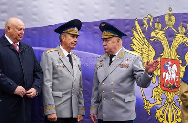 Первый заместитель председателя комитета по обороне Госдумы РФ Андрей Красов (слева) и генерал-лейтенант Сергей Хлебников (второй слева). Торжественная церемония посвящения в кадеты воспитанников Первого Московского кадетского корпуса на ВДНХ.