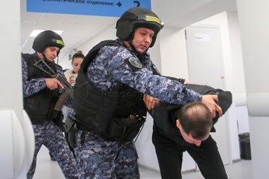 Показательные учения сотрудников Главного управления Росгвардии по Подмосковью в Одинцовской ЦРБ при срабатывании тревожных сигнализаций в медицинских учреждениях для защиты больниц и медработников.