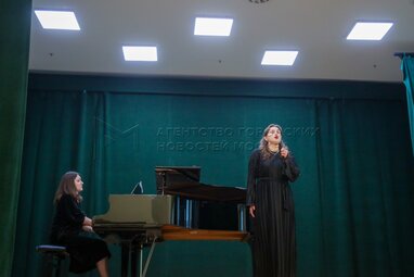 Студентка первого курса Московской консерватории Александра Согава (справа) во время выступления на церемонии открытия барельефа народной артистки СССР Бэлы Руденко в Московской государственной консерватории имени Чайковского.