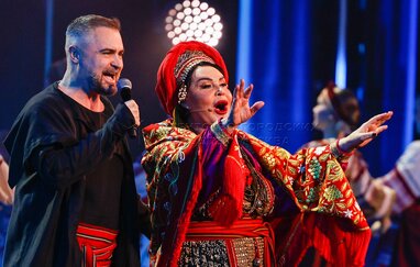 Певцы Олег Газманов, Надежда Бабкина и ансамбль «Русская песня». Концерт «Страна талантов» в Москве в честь 50-летия ансамбля «Русская песня» в Московском государственном академическом театре «Русская песня».