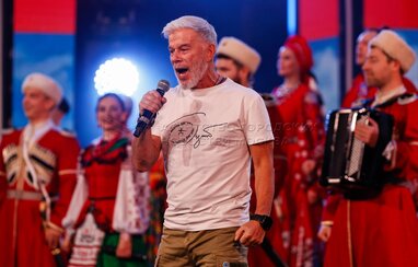 Певец Олег Газманов. Концерт «Страна талантов» в Москве в честь 50-летия ансамбля «Русская песня» в Московском государственном академическом театре «Русская песня».