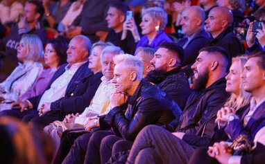 Актер Сергей Никоненко (слева по центру) и певец Шаман (в центре). Концерт «Страна талантов» в Москве в честь 50-летия ансамбля «Русская песня» в Московском государственном академическом театре «Русская песня».
