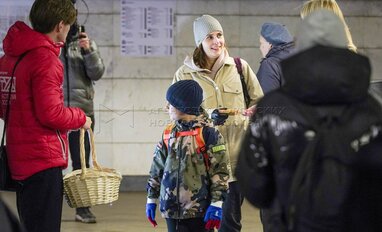 Раздача пряников на станции «Тульская» в честь запуска поезда «Тульская область» в Московском метрополитене.