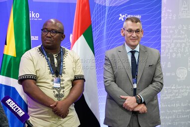 Генеральный директор группы музеев Iziko (Кейптаун, ЮАР) – Леннокс Собале Туквайо (слева) и генеральный директор Музея Арте (Дубай, ОАЭ) – Дэни Самаха во время Международного научно-туристического форума «Открой атом» в музее «Атом» на ВДНХ.