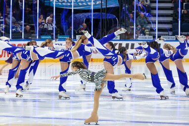 Выступление девушек группы поддержки ХК «Динамо» перед началом встречи между столичными клубами «Динамо» и ЦСКА на стадионе «ВТБ Арена» в рамках регулярного чемпионата Континентальной хоккейной лиги (КХЛ).