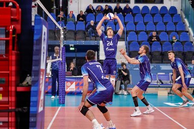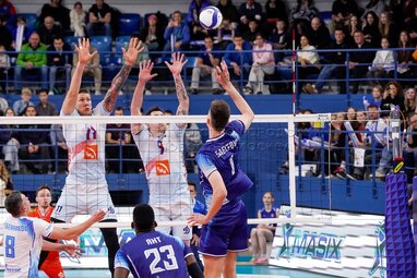 Игровой момент матча четвертого тура Суперлиги мужского чемпионата России по волейболу между московским «Динамо» и петербургским «Зенитом» на волейбольной арене «Динамо».