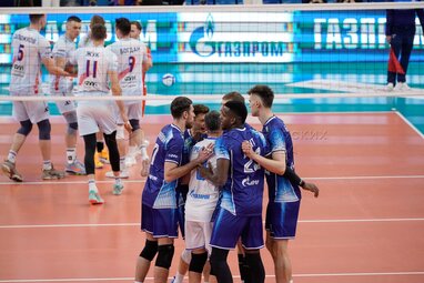 Команда «Зенита» во время матча четвертого тура Суперлиги мужского чемпионата России по волейболу между московским «Динамо» и петербургским «Зенитом» на волейбольной арене «Динамо».