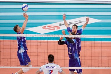 Игроки «Зенита» слева направо – Станислав Динейкин и Женя Гребенников во время матча четвертого тура Суперлиги мужского чемпионата России по волейболу между московским «Динамо» и петербургским «Зенитом» на волейбольной арене «Динамо».
