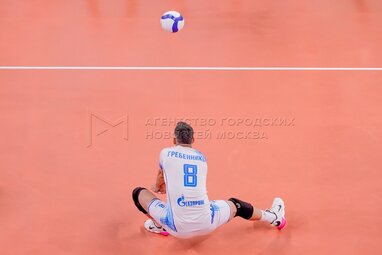 Игрок «Зенита» Женя Гребенников во время матча четвертого тура Суперлиги мужского чемпионата России по волейболу между московским «Динамо» и петербургским «Зенитом» на волейбольной арене «Динамо».
