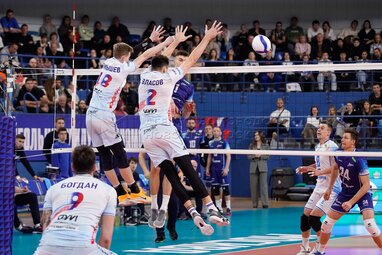 Игроки слева направо – Денис Богдан (Динамо), Антон Семышев (Динамо), Илья Власов (Динамо), Владислав Бабкевич (Зенит), Женя Гребенников (Зенит) и Игорь Кобзарь (Зенит) во время матча четвертого тура Суперлиги мужского чемпионата России по волейболу между московским «Динамо» и петербургским «Зенитом» на волейбольной арене «Динамо».