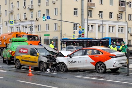 Последствия лобового столкновения фургона Lada и автомобиля каршеринга в районе д. 8 на Ленинском проспекте.