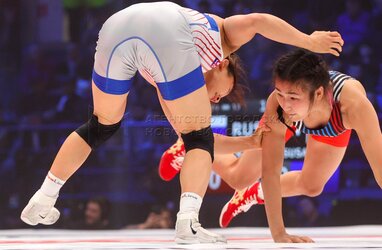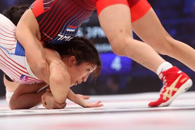 Женская борьба: Нонока Озаки (Япония) – Алина Касабиева (Россия). Международные соревнования «Кубок сильнейших спортсменов» по спортивной борьбе на волейбольной арене «Динамо».
