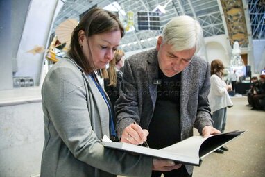Автор романа «Авиатор» Евгений Водолазкин дает автограф на выставке «Я всемогущ – я авиатор», посвященной истории советской авиации и образам героев-летчиков, в центре «Космонавтика и авиация» на ВДНХ.
