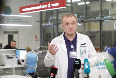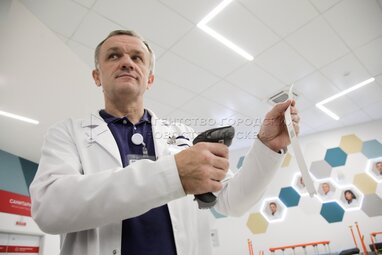 Главный врач ГКБ №15 имени О. М. Филатова Валерий Вечорко во время демонстрации работы системы идентификации пациентов по QR-кодам в стационарных отделениях городских больниц.