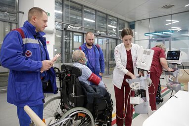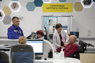 Пациенты в инвалидных креслах в приемном отделении Флагманского центра экстренной помощи ГКБ №15 имени О. М. Филатова. Внедрение системы идентификации пациентов по QR-кодам в стационарных отделениях городских больниц.
