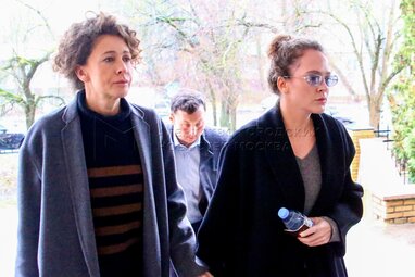 Актриса Ксения Раппопорт (слева) и ее дочь актриса Аглая Тарасова перед началом заседания в Домодедовском городском суде по уголовному делу Аглаи Тарасовой о контрабанде вейпа с маслом каннабиса.