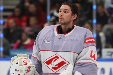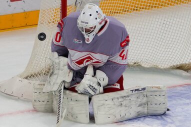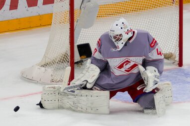 Вратарь «Спартака» Александр Георгиев в матче регулярного чемпионата Континентальной хоккейной лиги (КХЛ) между московскими клубами «Динамо» и «Спартак» на стадионе «ВТБ Арена».