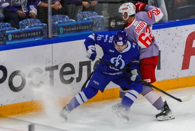 Игрок «Динамо» Максим Мамин и игрок «Спартака» Даниил Орлов (слева направо) в матче регулярного чемпионата Континентальной хоккейной лиги (КХЛ) между московскими клубами «Динамо» и «Спартак» на стадионе «ВТБ Арена».
