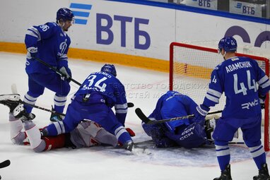 Вратарь «Динамо» Владислав Подъяпольский (в центре) в матче регулярного чемпионата Континентальной хоккейной лиги (КХЛ) между московскими клубами «Динамо» и «Спартак» на стадионе «ВТБ Арена».