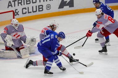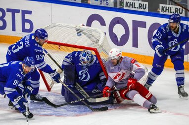 Вратарь «Спартака» Александр Георгиев, игрок «Спартака» Андрей Миронов, игрок «Динамо» Джордан Уил, игрок «Спартака» Вениамин Королев и игрок «Динамо» Дилан Сикура (слева направо) в матче регулярного чемпионата Континентальной хоккейной лиги (КХЛ) между московскими клубами «Динамо» и «Спартак» на стадионе «ВТБ Арена».