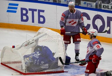 Хоккеист Иван Морозов («Спартак»), вратарь Владислав Подъяпольский («Динамо») (слева направо) во время матча регулярного чемпионата Континентальной хоккейной лиги (КХЛ) между московскими клубами «Динамо» и «Спартак» на стадионе «ВТБ Арена».
