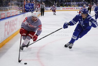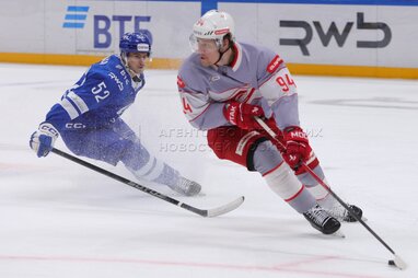 Хоккеисты Александр Кисаков («Динамо»), Иван Морозов («Спартак») (слева направо) во время матча регулярного чемпионата Континентальной хоккейной лиги (КХЛ) между московскими клубами «Динамо» и «Спартак» на стадионе «ВТБ Арена».