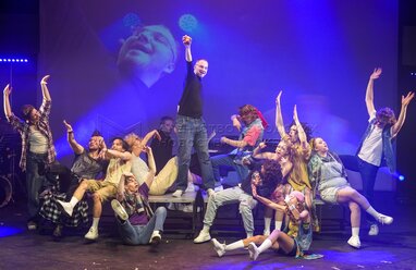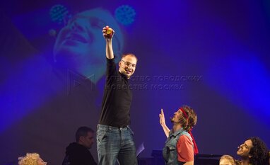 Богдан Ханин в роли Стива Джобса (в центре) на премьерном показе музыкального спектакля Марка Розовского «Джобс» о жизни одного из основателей компании Apple Стива Джобса в Московском государственном театре «У Никитских ворот».