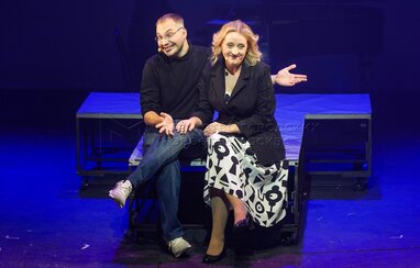 Василий Рахманин в роли Возняка и Богдан Ханин в роли Стива Джобса (слева направо) на премьерном показе музыкального спектакля Марка Розовского «Джобс» о жизни одного из основателей компании Apple Стива Джобса в Московском государственном театре «У Никитских ворот».