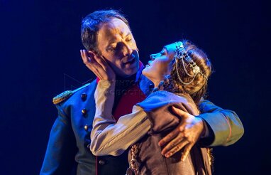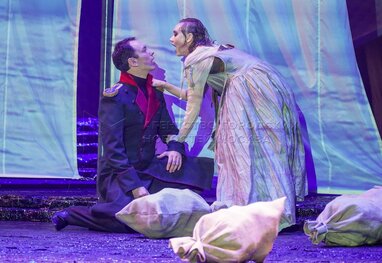 Дмитрий Высоцкий (Максим Максимович, он же доктор Вернер) и Анастасия Епифанова (Бэла) на показе спектакля «Герой нашего времени?» в постановке режиссера Антона Яковлева перед премьерой в Московском драматическом театре имени Гоголя.